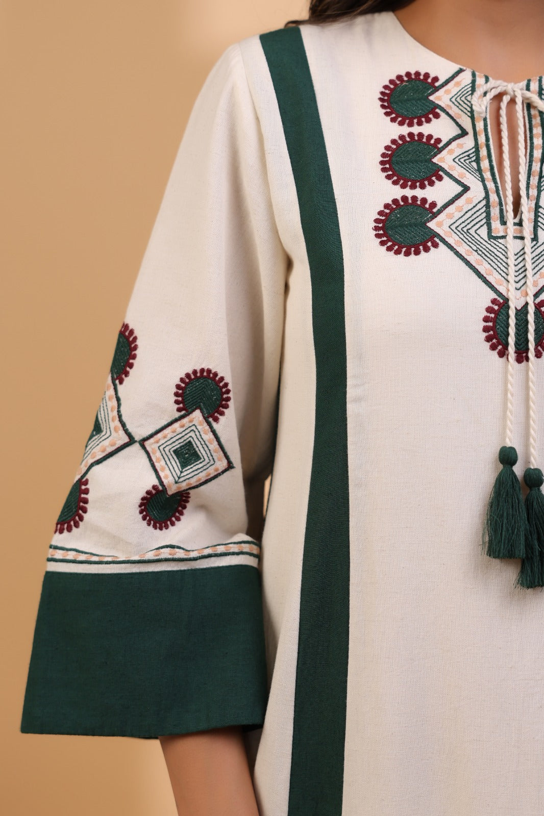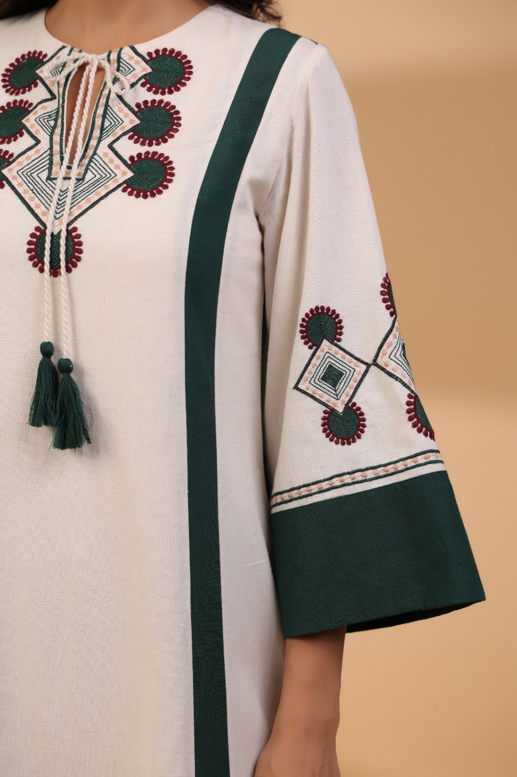 Gracefully refined and effortlessly stylish, this Beige A-line Midi Dress is perfect for festive gatherings, weddings, or even a polished casual day out. Featuring a flattering V-neckline and chic 3/4th sleeves, its versatile silhouette blends contemporary elegance with comfort. A perfect pick for women who love a blend of grace and ease.