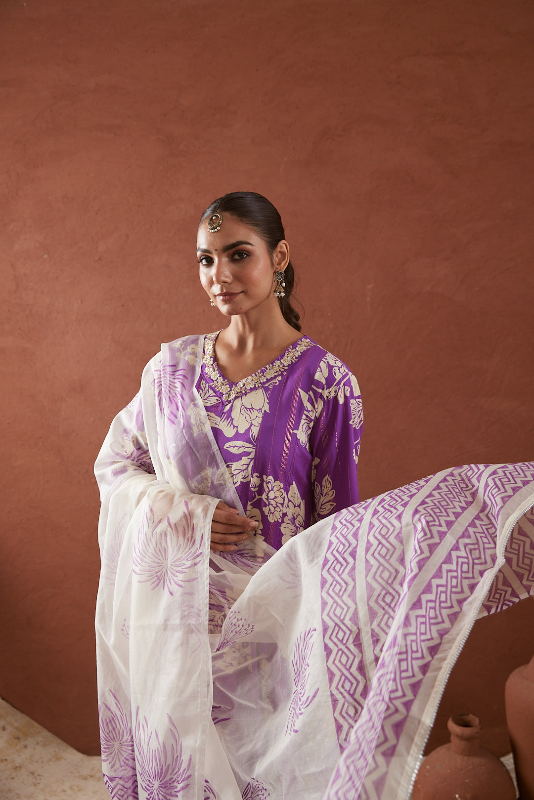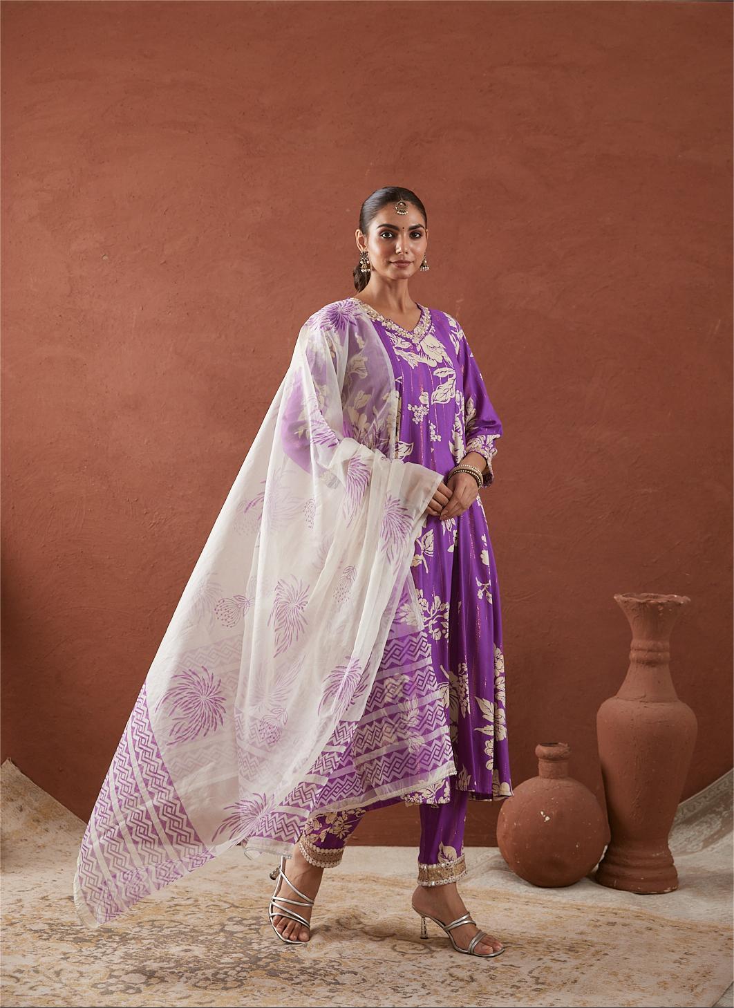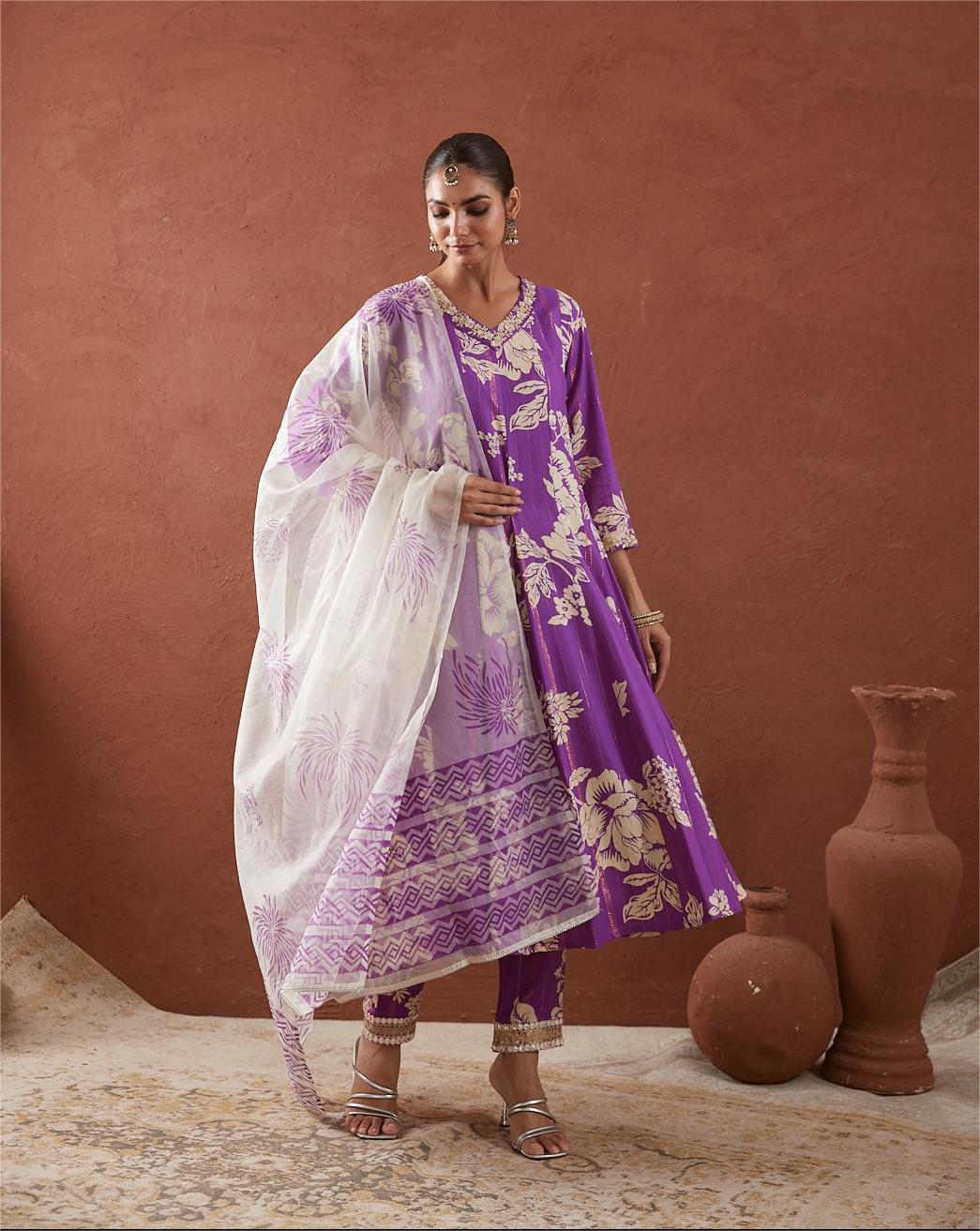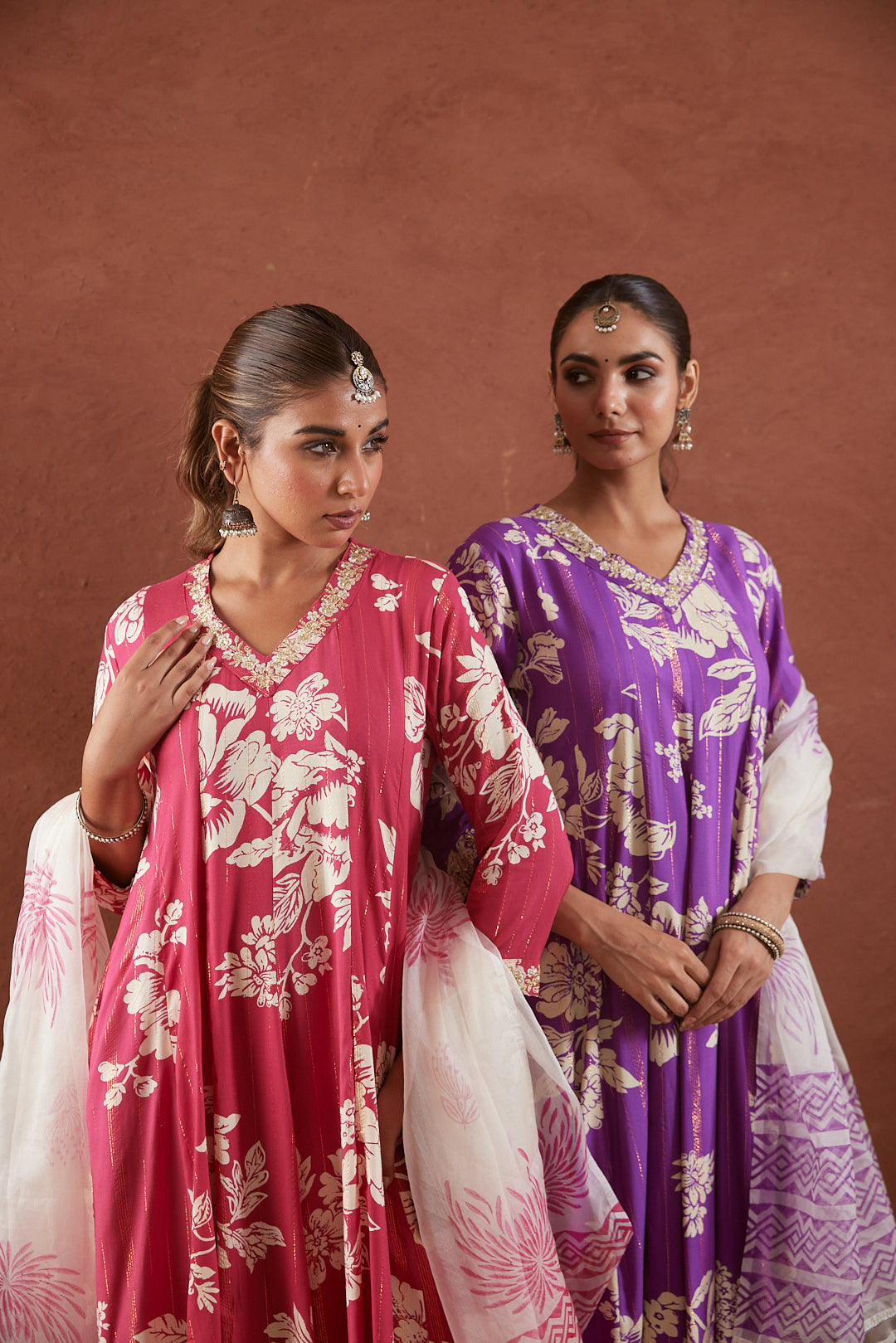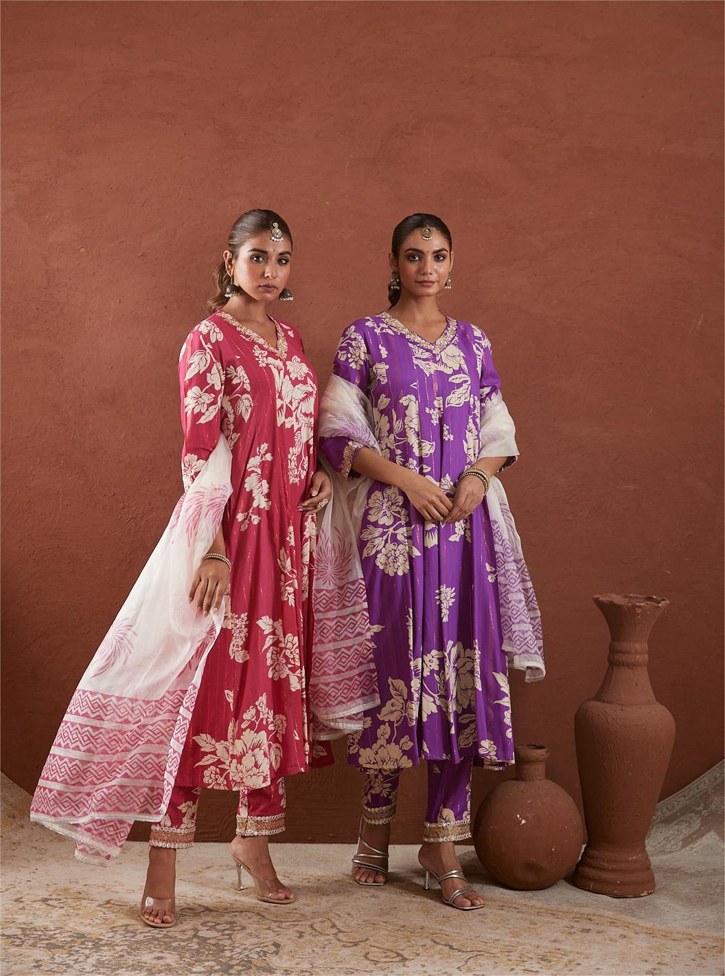Magenta Violet Harmony is a celebration of color and craftsmanship. This floral suit set beautifully merges the vibrancy of magenta with the serene charm of violet, creating a perfect balance of tradition and modernity. Featuring delicate golden floral patterns, intricate detailing on the neckline, and paired with a soft printed dupatta, this ensemble is designed to make you shine with effortless grace. Ideal for festive gatherings, weddings, or special occasions, it’s a statement piece that radiates harmony, elegance, and timeless beauty.