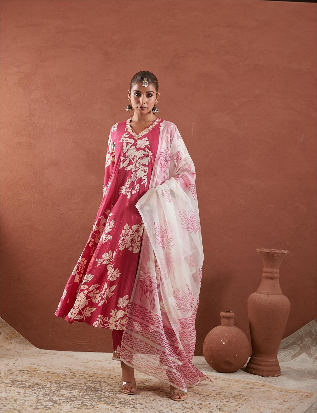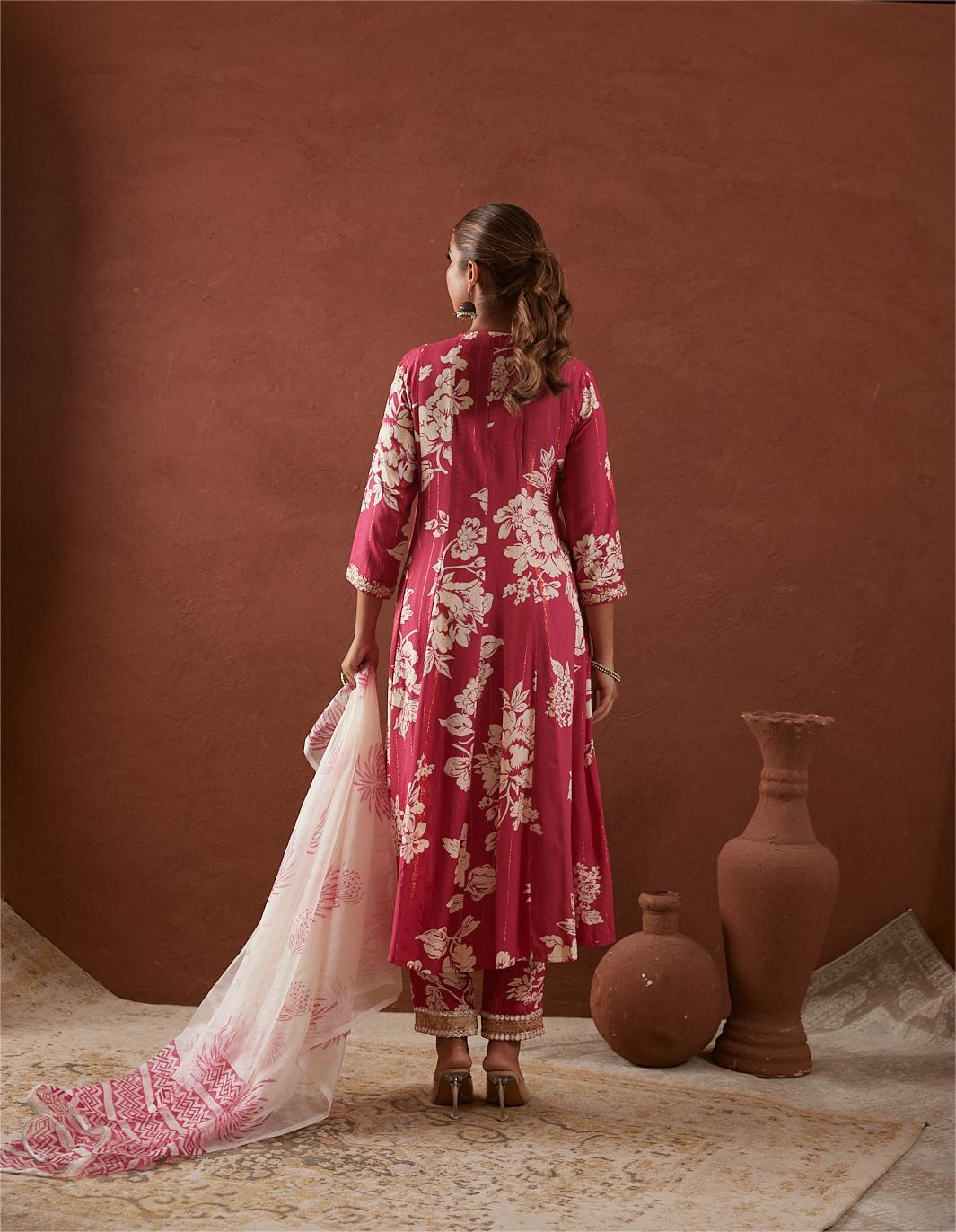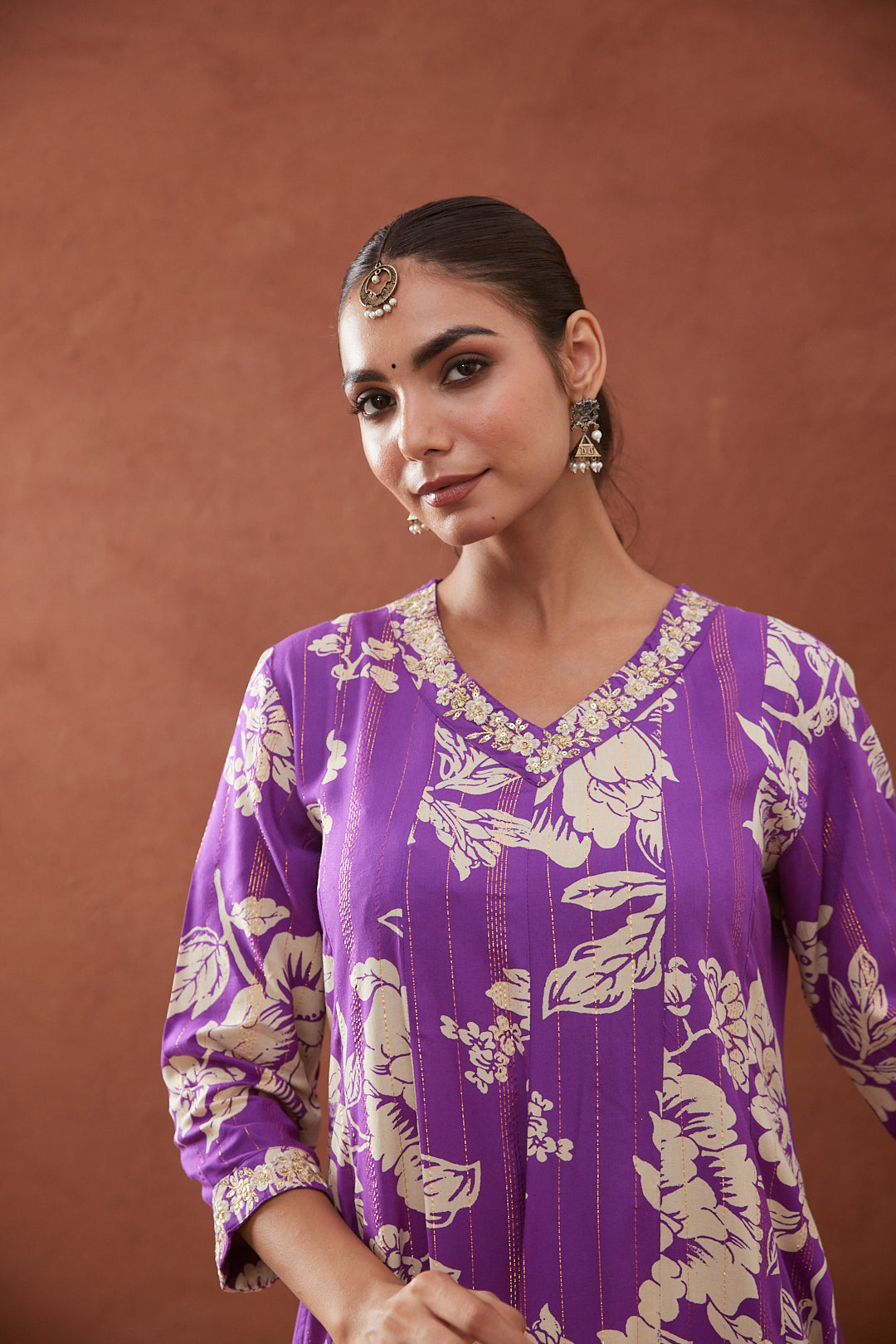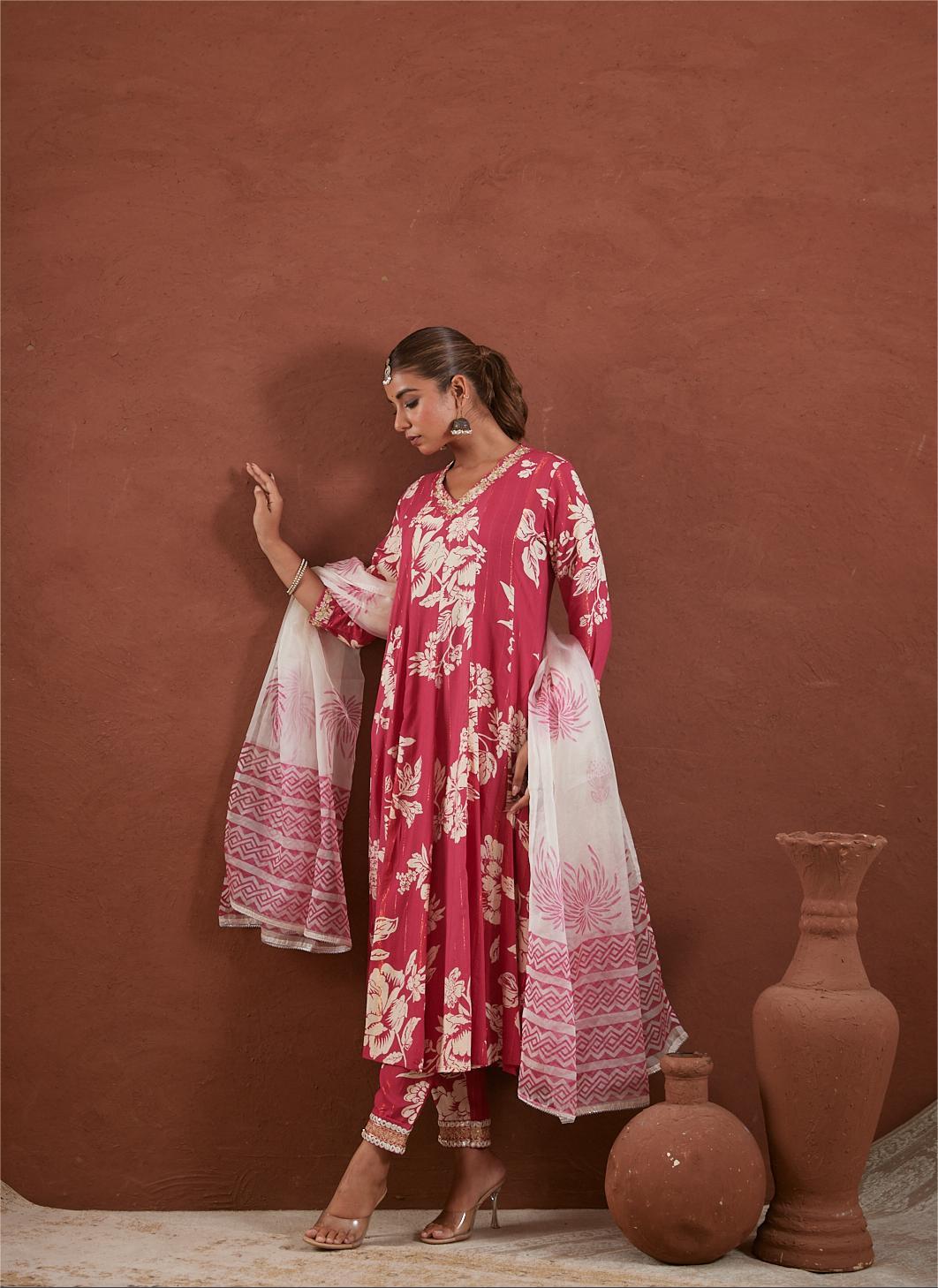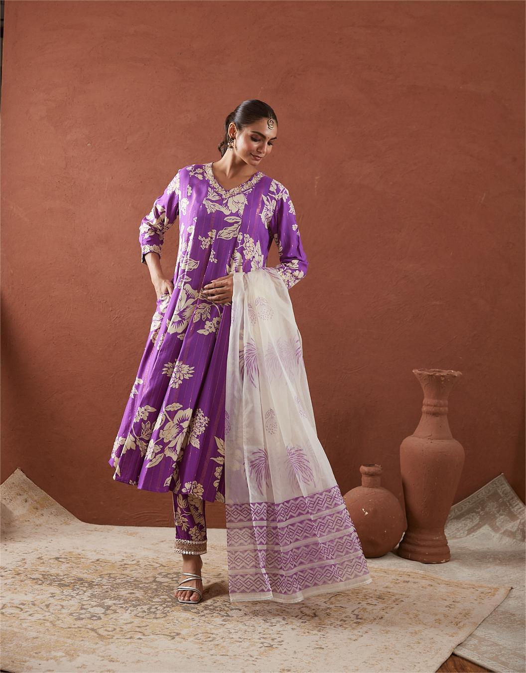 Magenta Violet Harmony is a celebration of color and craftsmanship. This floral suit set beautifully merges the vibrancy of magenta with the serene charm of violet, creating a perfect balance of tradition and modernity. Featuring delicate golden floral patterns, intricate detailing on the neckline, and paired with a soft printed dupatta, this ensemble is designed to make you shine with effortless grace. Ideal for festive gatherings, weddings, or special occasions, it’s a statement piece that radiates harmony, elegance, and timeless beauty.