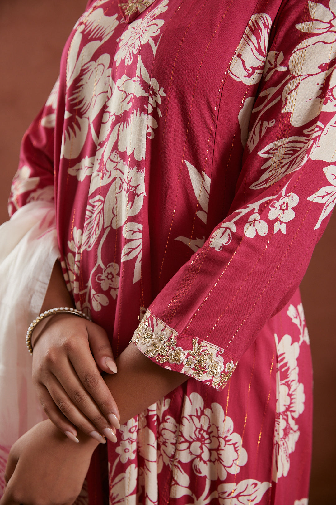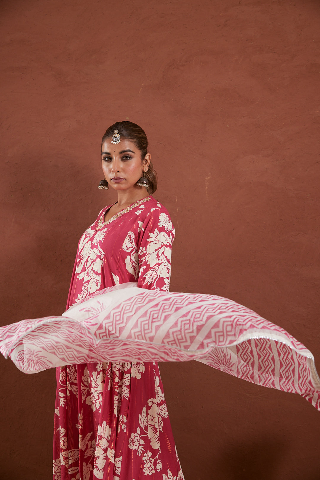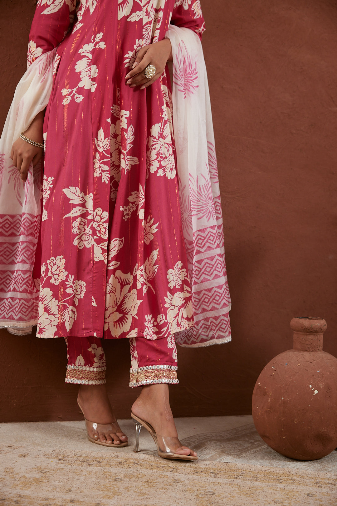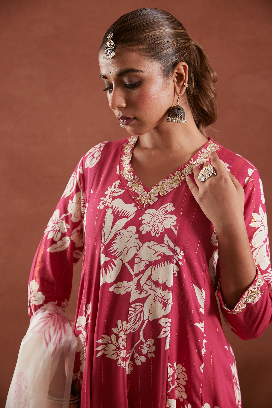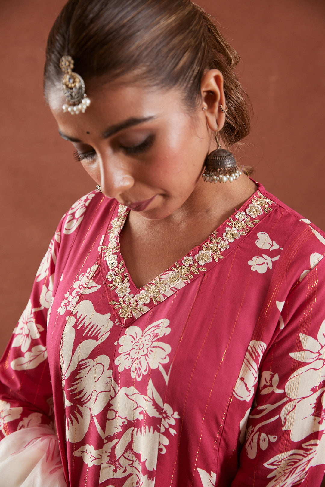 Magenta Violet Harmony is a celebration of color and craftsmanship. This floral suit set beautifully merges the vibrancy of magenta with the serene charm of violet, creating a perfect balance of tradition and modernity. Featuring delicate golden floral patterns, intricate detailing on the neckline, and paired with a soft printed dupatta, this ensemble is designed to make you shine with effortless grace. Ideal for festive gatherings, weddings, or special occasions, it’s a statement piece that radiates harmony, elegance, and timeless beauty.