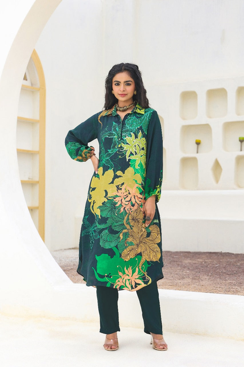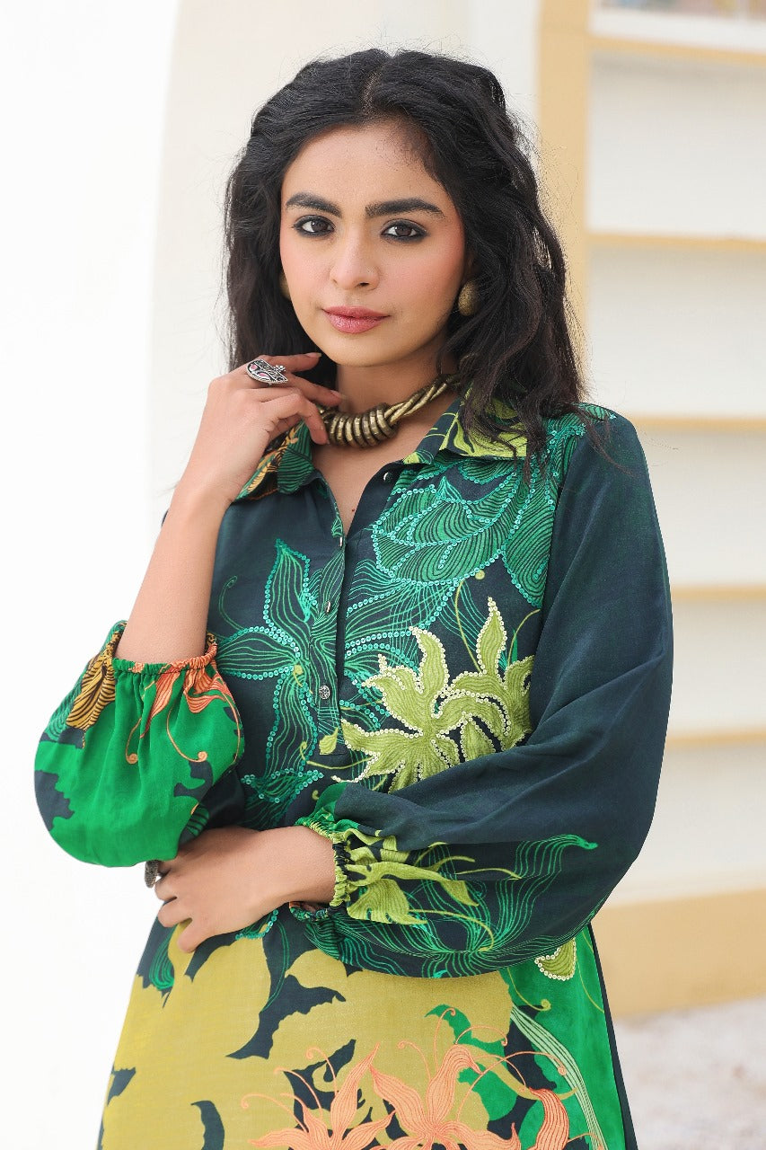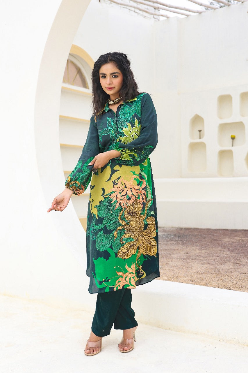 Step into effortless sophistication with “The Green Garden” – a bold and artistic suit set that captures the lush beauty of nature. This elegant green base kurti, paired with matching pants, is brought to life with vibrant floral prints in fresh shades of lime, ochre, and teal. The kurti features a smart shirt-style collar, 3/4th sleeves, and a straight-cut silhouette, blending modern appeal with ethnic charm.
